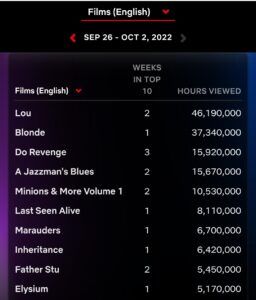 The reason we are saying this is the chart above. Blonde was the biggest Netflix release last week. But still, it lags dramatically behind Lou which had already enjoyed a phenomenal run last week.