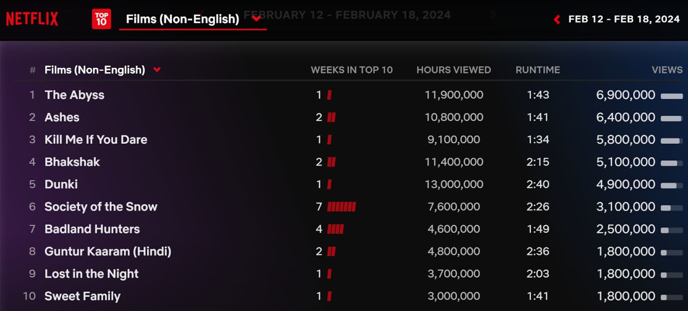 Let’s come to the OTT numbers. The movie was the most-watched non-English film on Netflix last week. See for yourself…