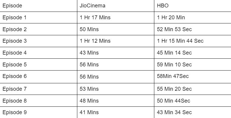 Technically, no. Some fans who have watched both HBO’s and JioCinema’s versions of the show claim that there are no cuts at all. The episode lengths are shorter, but JioCinema didn’t make any changes to what they received from HBO.