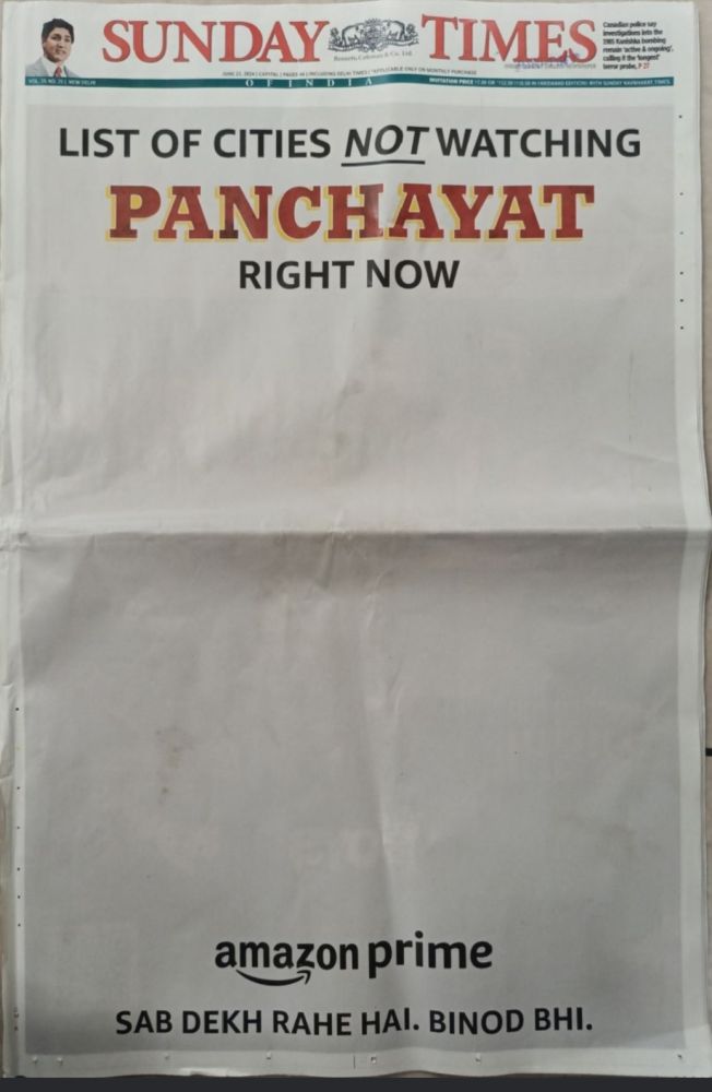This ad belongs to this Sunday and how creative it is. Despite all the success, Panchayat Season 3 does not seem to stop. Looks like Mirzapur Season 3 will put a break on this. But more importantly, it will be interesting to see what kind of innovation tactics and ads Prime Video employs to boost Mirzapur Season 3. For more such interesting stories, don’t forget to follow Binged.