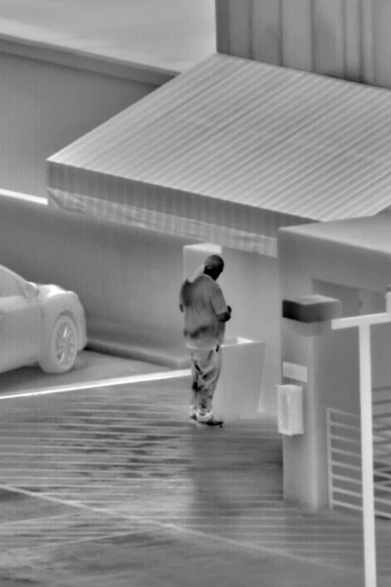 Public light rips through the night of a modern city. Sleeplessness is lit up by a computer monitor in an urban space, where day and night are no longer distinguished. Starting from videos of thermal cameras found online, a reflection goes through the changes in the contemporary city, the extension of social control mechanisms and the evolution of digital technologies to face the frontiers of a progressive expansion of the field of visible – and controllable – in the surveillance society.