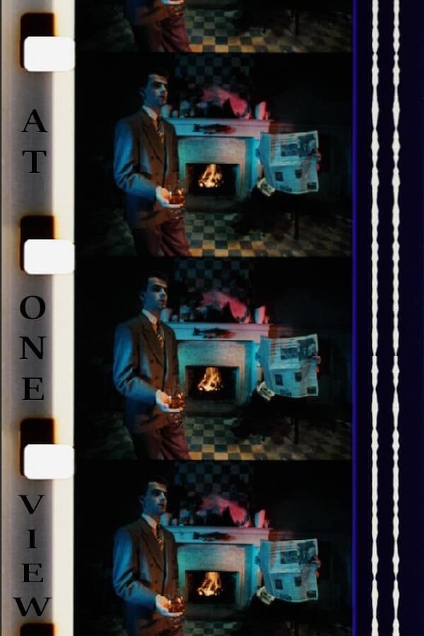 Two men in chairs by the open hearth; photos move in front of their heads.