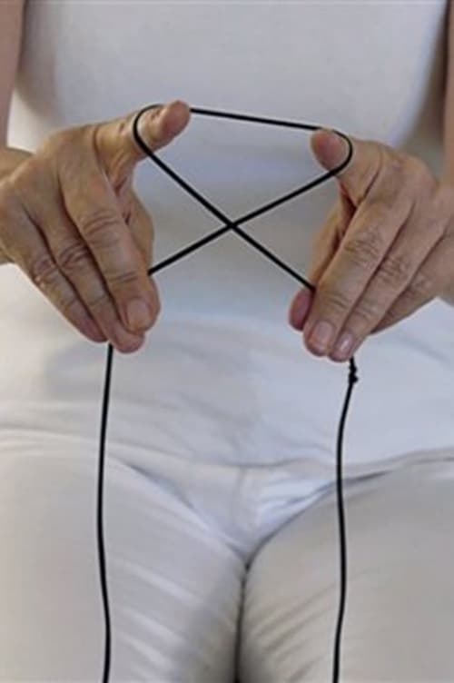 “Between Hands is a double video. It revolves around the theme of knols and string games: both “cat’s cradle”, which lives on in our culture as a game for little girls, as well as the similar games played by almost all Indigenous peoples, with an astonishing variety of figures. The video alternates between reflections on subjectivity from a text by the writer Ani Bustamante, and a selection of poems by the Cree community.” – Eva Lootz