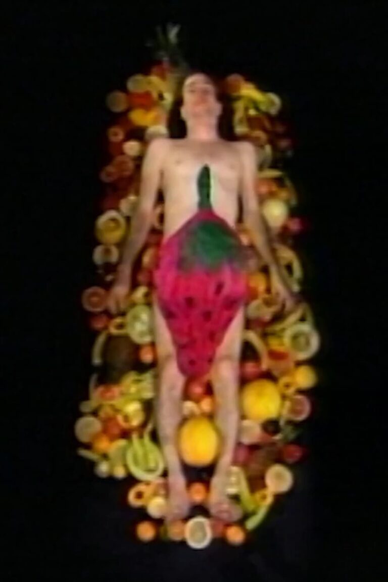 This collaborative video project is based on a short story by H.G. Wells called “The Country of the Blind”—about a man who travels to a country of blind people and attempts to dominate their sensual, feminine culture with his male, sight-derived power. Following this theme, “Blind Country” begins with animated fruit dancing over Mike Kelley’s body and the admonition of “Northerners” to “refill the quickly emptying sack.” In the male-dominated land of the North, candy-spurting pinatas stand as phallic symbols. Presumably castrated, and stripped of his authority, Kelley acts the buffoon as he is led through the murky land of the South, a “female,” earthy, “realm of the senses” opposing the phallocentric world of the North.