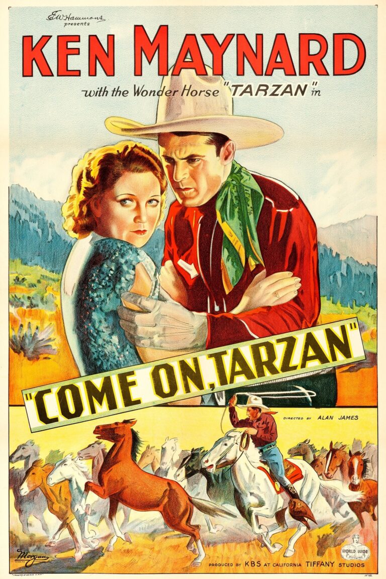 Ken Maynard’s exceptionally intelligent horse, Tarzan the Wonder Horse, is the star of this western about evil cowboy Steve Frazer (Welch) who gathers horses for slaughter, whose meat is sold to pet food manufacturers. The wild horse Tarzan frees the doomed horses from their corrals, and Frazer convinces the Sheriff that Tarzan is a threat and can be shot on sight. Local cowboy Ken Benson (Maynard) and rancher Pat Riley (Kennedy) work together to clear Tarzan’s good name and put Frazier behind bars for his evil deeds.
