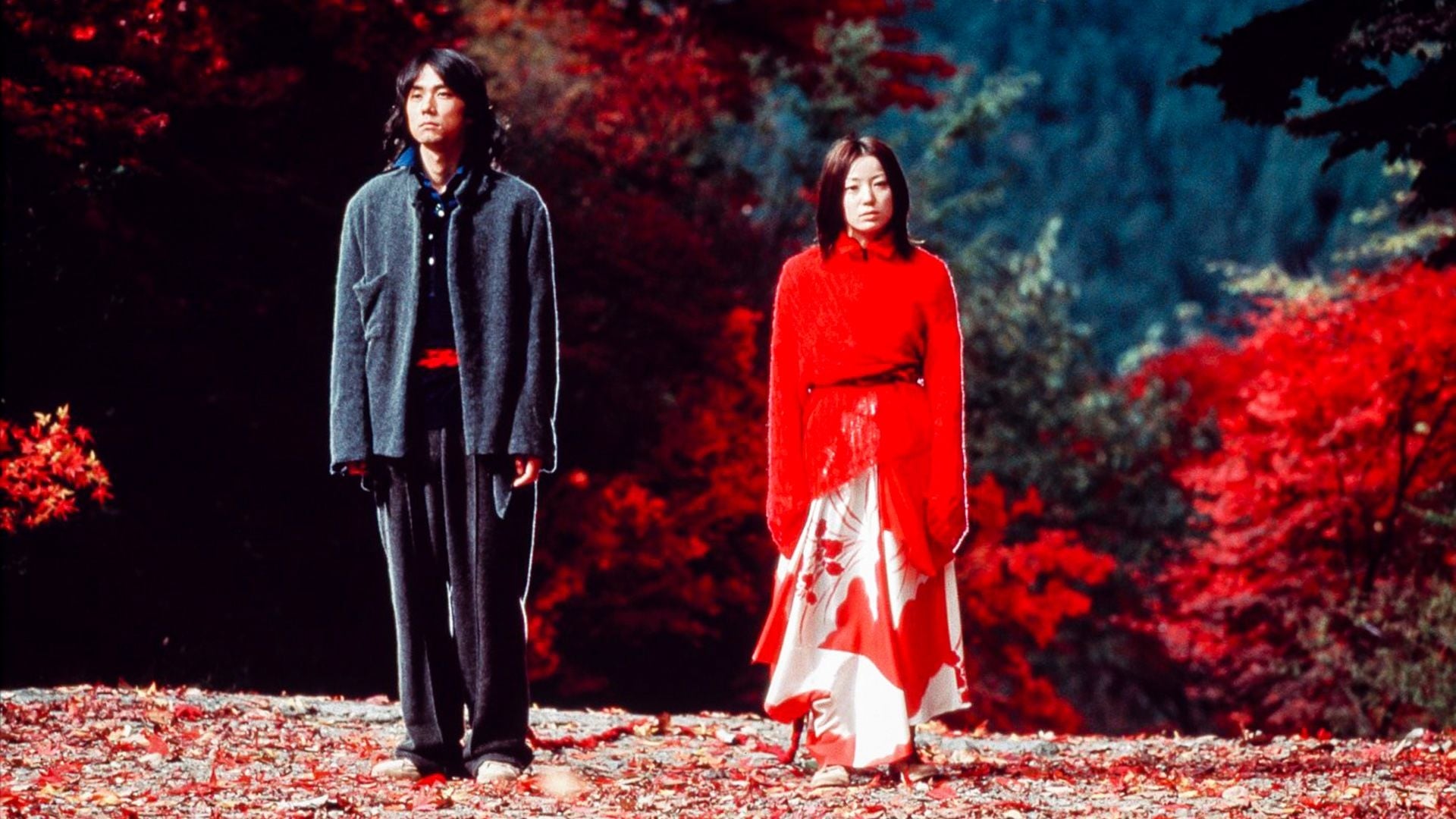 Dolls takes puppeteering as its overriding motif, which relates thematically to the action provided by the live characters. Chief among those tales is the story of Matsumoto and Sawako, a young couple whose relationship is about to be broken apart by the former’s parents, who have insisted their son take part in an arranged marriage to his boss’ daughter.