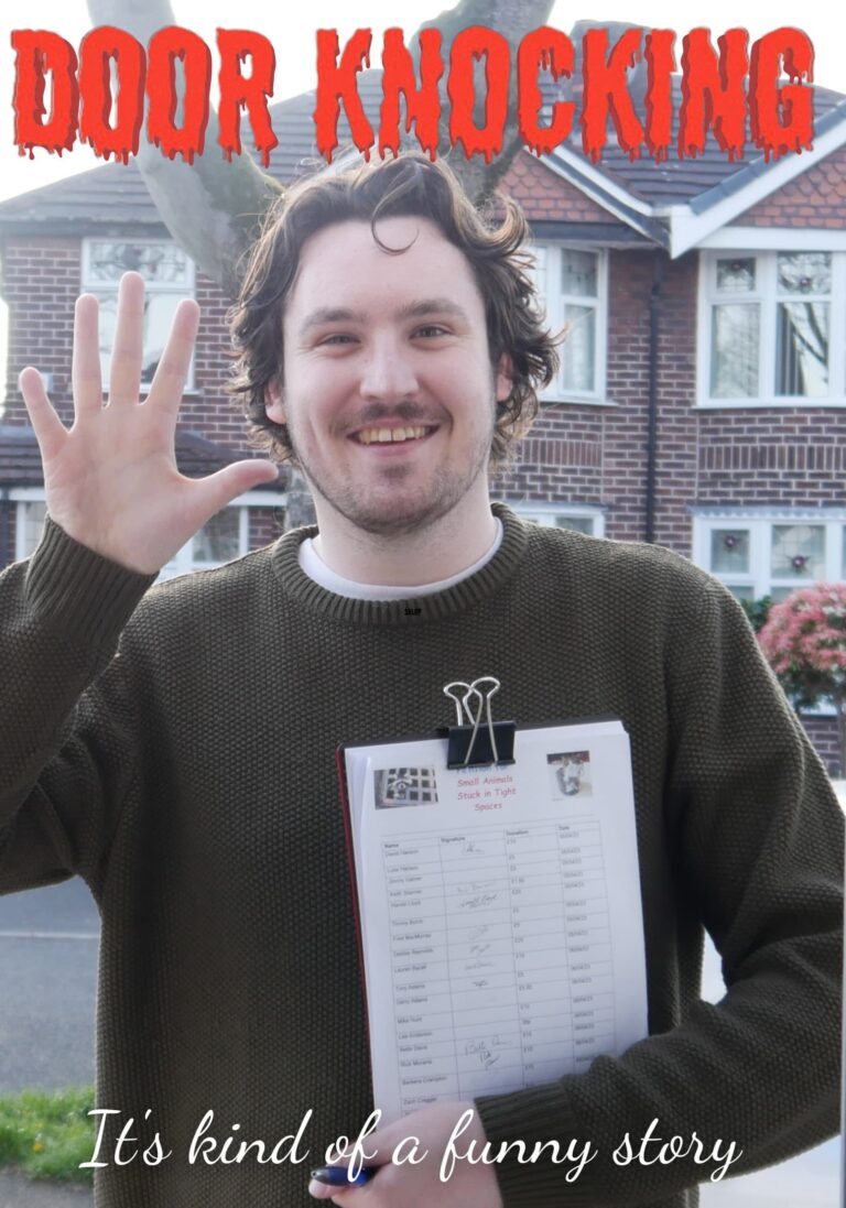 Michael is a young activist walking through a suburban neighbourhood knocking on doors for his cause. He’s invited inside one of the houses for tea & biscuits but is unaware that the owner of the house has a severed head in their kitchen.