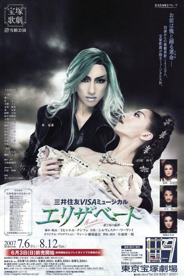 Takarazuka Revue’s 2007 production of the Viennese musical Elisabeth. The musical tells the story of Elisabeth (“Sisi”), the Empress of Austria, from her engagement and marriage in 1854 to her murder in 1898 at the hands of the Italian anarchist Luigi Lucheni, through the lens of her growing obsession with death, as her marriage and her empire crumble around her at the turn of the century.