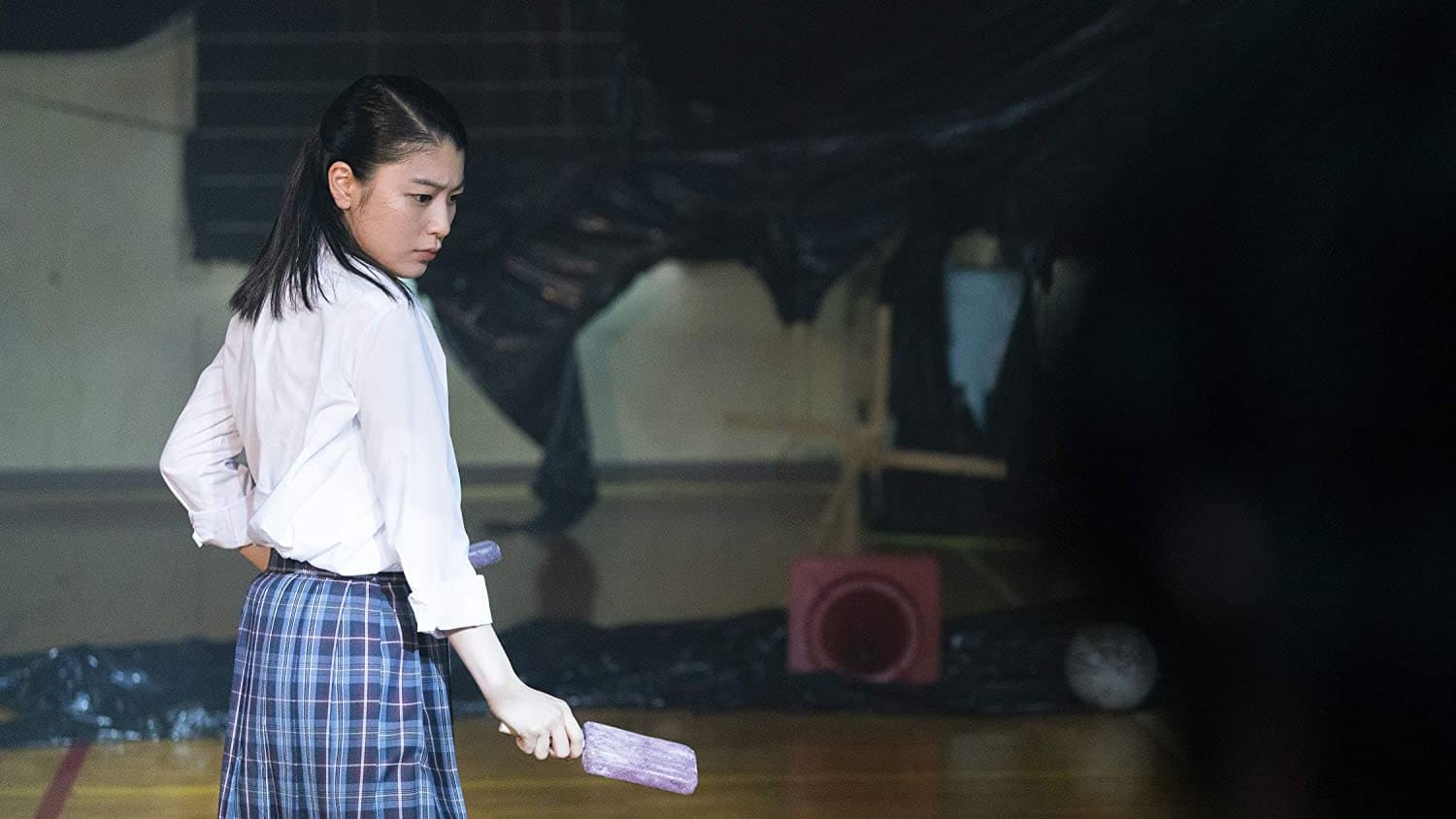 The shooting of a low-budget adolescent romantic drama has started in a ruined school, aiming to make a quick profit. Akira Kurosawa, an untalented assistant director (unlike his prestigious namesake) is having a hard time on set. His only reason for continuing is his script of “Ghostmaster” that he carries with him, hoping that it will get produced as his directorial debut film. Sadly however, Kurosawa finds out there is no chance that his project will ever see the light. He goes into a depressed rage that transfers evil energy into the script of “Ghostmaster”, which in turn possesses self-obsessed Yuya, the main actress of the romantic drama. Following the cursed “Ghostmaster” script, which has now been rewritten as a cruel and bloody romantic horror film, Yuya starts a blood bath by killing all the cast and crew one by one…