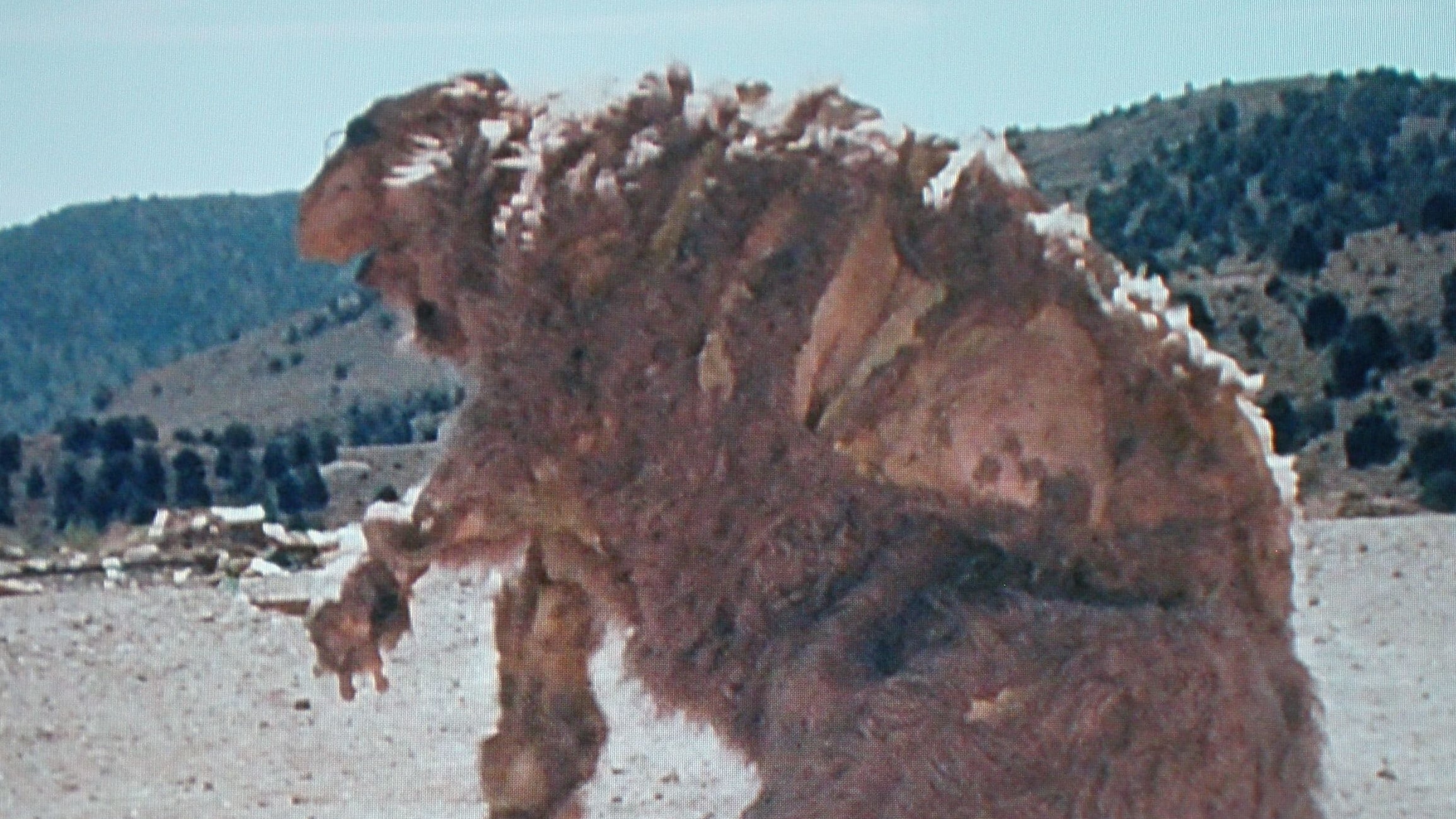 A mutant sheep is on the move near a ranch in the American West.