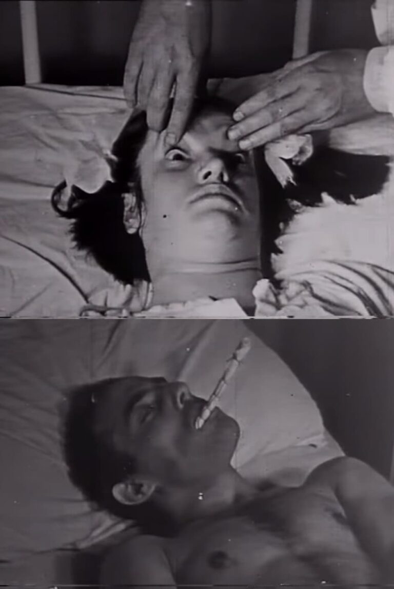 Hospital documentary on the testing of a medicine produced by a known pharmaceutical company on people considered psychiatrically calibrated that caused a “vascular storm” with horrible convulsions. Patients were discharged when they could make the fascist salute. Found at the market of the Fiera di Senigallia in Milan, signed by Grifi as ready-made.
