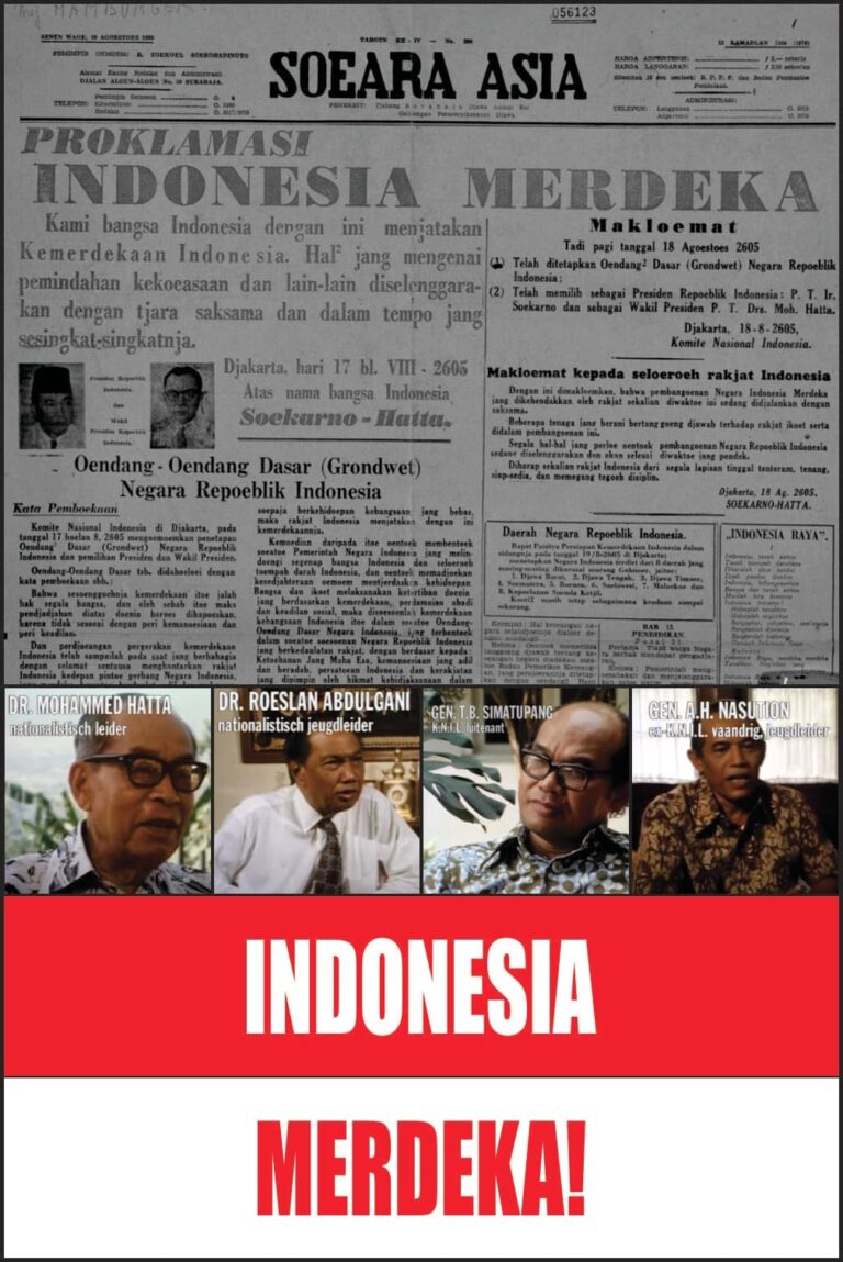 Documentary from 1976 about the Indonesian struggle for independence. Unique archive footage and interviews with former vice-president Mahammed Hatta (the only existing interview with him on film), journalist/writer Johan Fabricius, the physician dr. Abu Hafina, the nationalist youth leader Roelan Abgulgani, dr. P. J. Koets, at the time political adviser of the Lt. Governor-General, the Indonesian generals Nasution and Simaupang, and the planter couple Marsman.