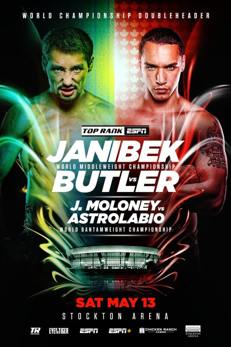Janibek Alimkhanuly returns to the ring to defend his WBO middleweight title against #6 Steven Butler at the Stockton Arena in Stockton, California.