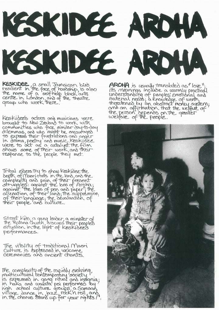 Keskidee, a small Jamaican bird resilient in the face of hardship, is also the name of a self-help black arts centre in London, and the theatre group who work there. Keskidee’s actors and musicians were brought to New Zealand to work with communities who face similar day-to-day dilemmas and who might be encouraged to express their frustrations and anger in drama, poetry and music. Keskidee were to act as a catalyst. the film shows some of their work and their response to the people they met. Tribal elders try to show keskidee the depth of Maori roots in the land, and the complexity and pain of their present struggles: against the loss of Aroha; against the laws of pen and paper; the alienation of their land; the suppression of their language; the devaluation of their people and culture.