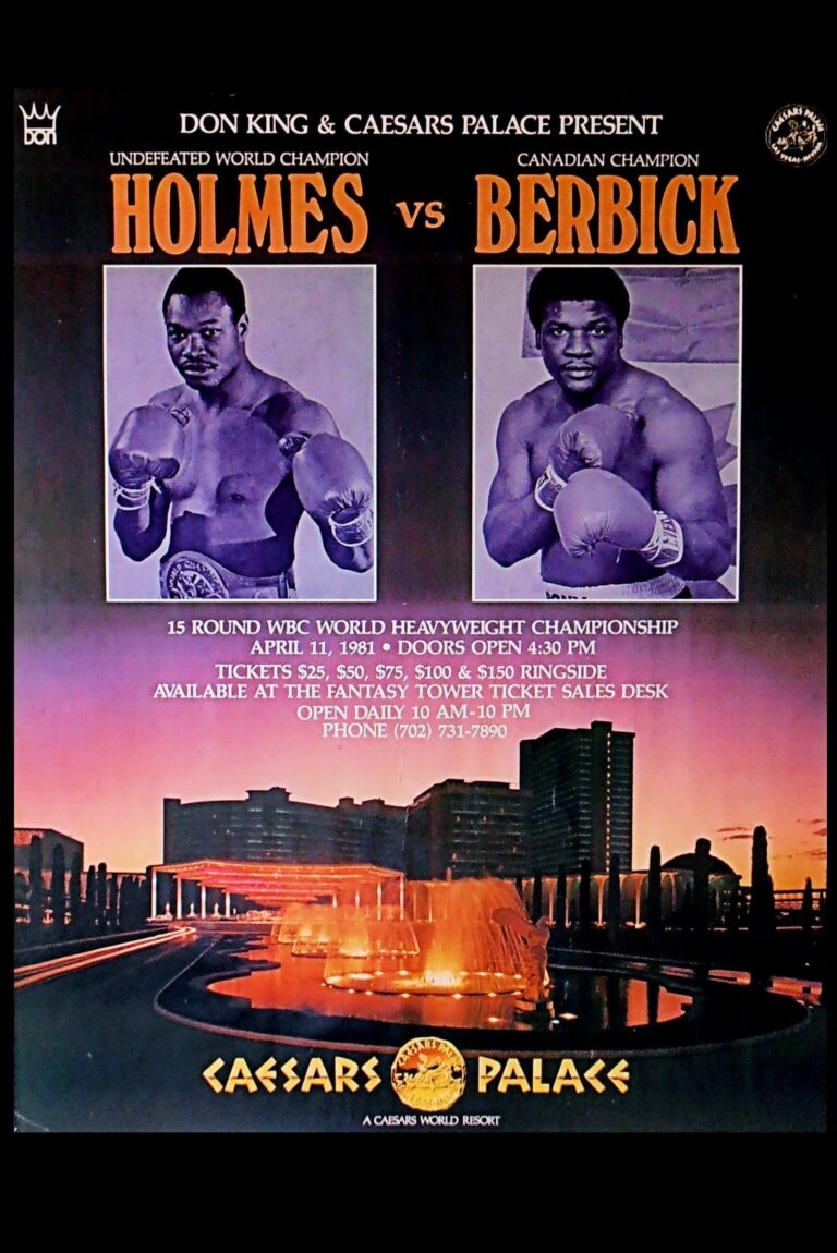 Larry Holmes defends his WBC heavyweight crown for the 9th time from challenger Trevor Berbick on April 11th, 1981 at Caesars Palace Sports Pavilion in Las Vegas. Larry’s record at the time of the fight was 36 wins to 0 losses.