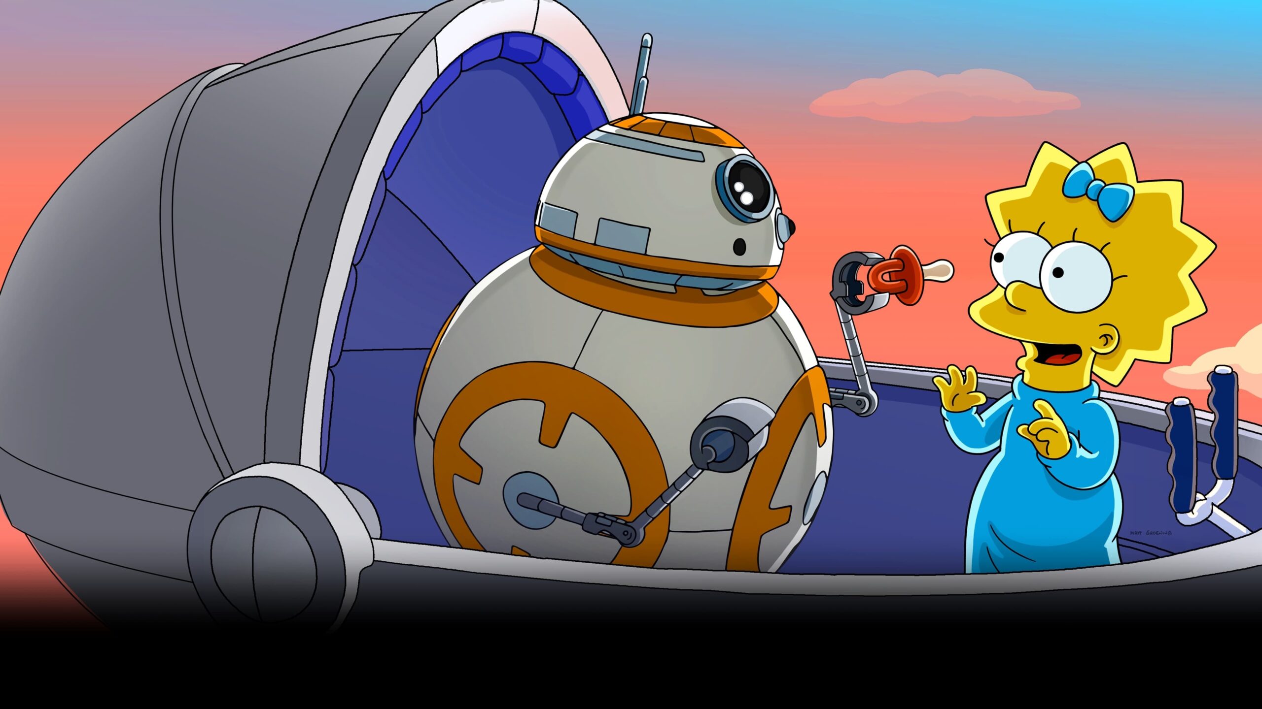 On their way to daycare, Homer loses track of Maggie who hops in Grogu’s hovering pram for a hyperspace-hopping adventure across the galaxy. Facing a squadron of Imperial TIE fighters, Maggie brings the battle to Springfield in this epic short celebrating all things Star Wars.