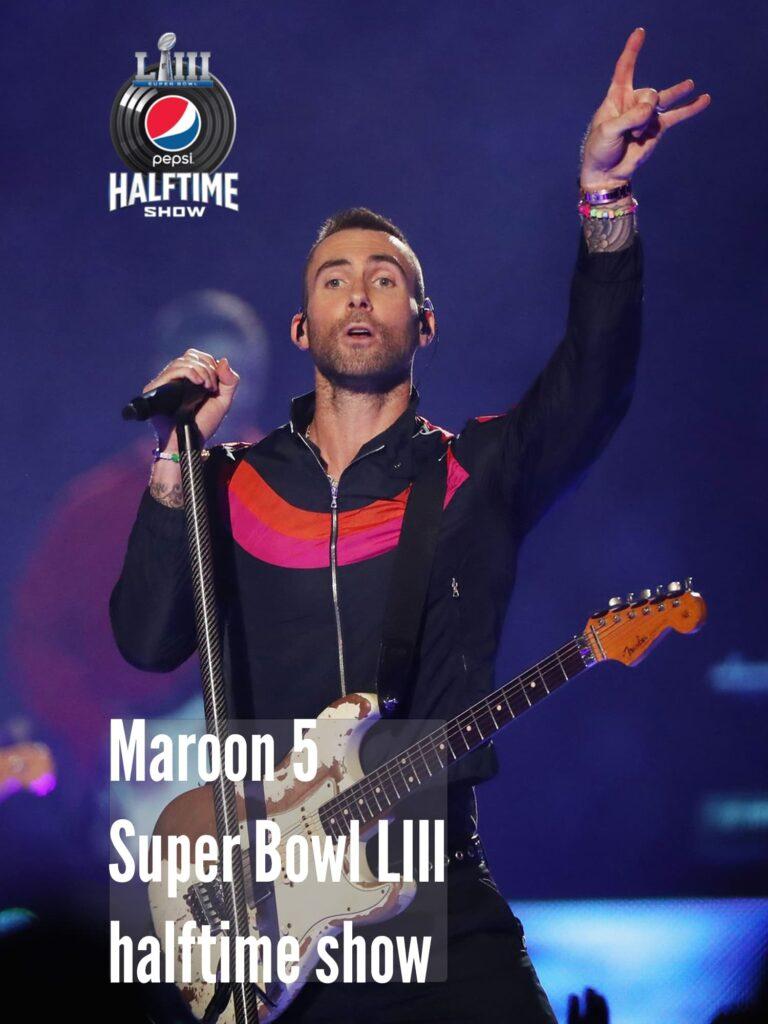 The Super Bowl LIII Halftime Show, officially known as the Pepsi Super Bowl LIII Halftime Show, took place on February 3, 2019 at Mercedes-Benz Stadium in Atlanta, Georgia, as part of Super Bowl LIII. It was headlined by American pop group Maroon 5, joined by rappers Big Boi and Travis Scott as guests. Setlist: Harder to Breathe, This Love, Trumpet fanfare (interlude) (contains scene from “Band Geeks” and features the cast of SpongeBob SquarePants), Sicko Mode (Travis Scott solo), Girls Like You, She Will Be Loved, Kryptonite (I’m on It) (Big Boi solo), The Way You Move (Big Boi solo), Sugar, Moves like Jagger.