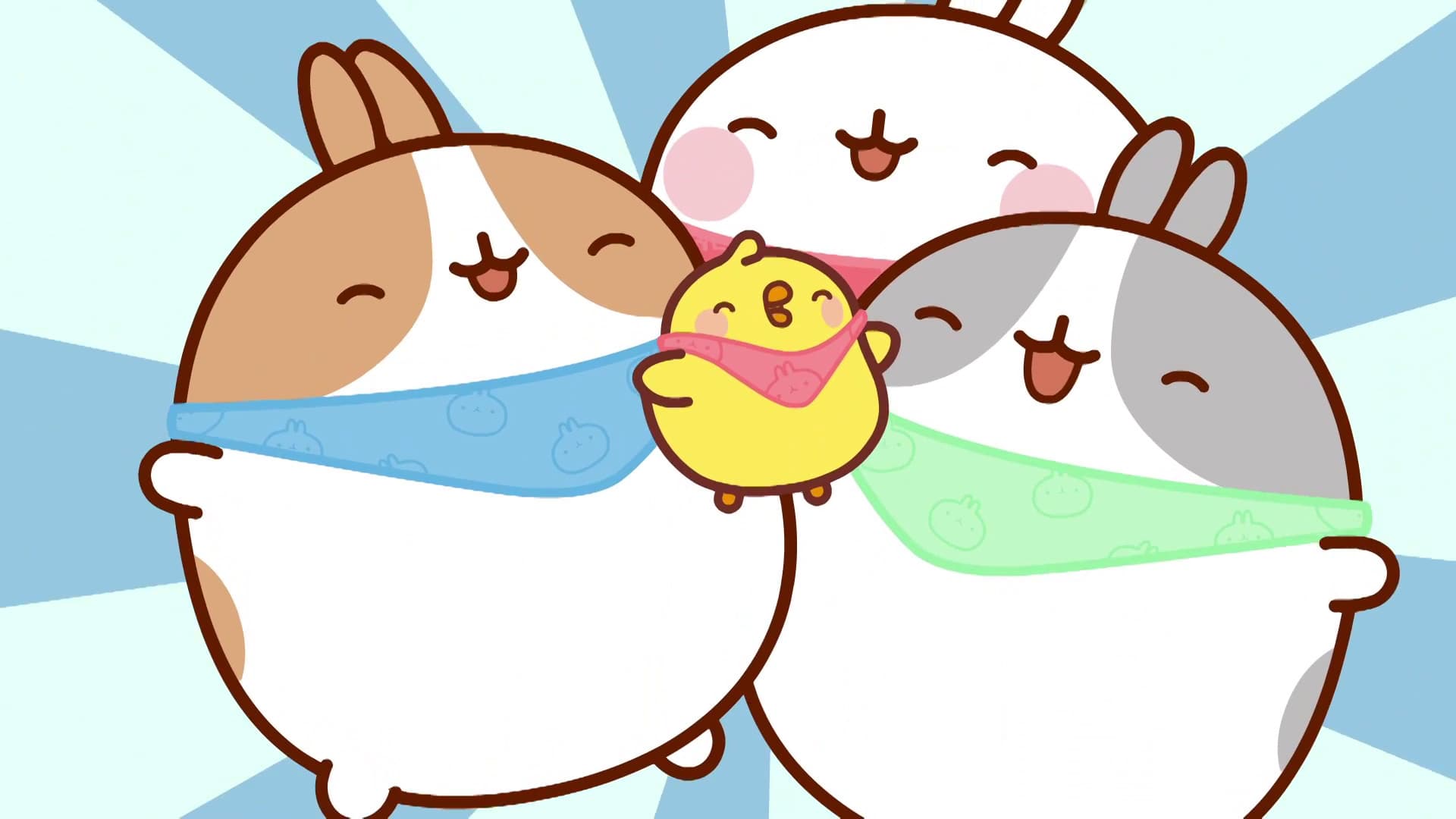 Molang is an affectionate and humorous perspective on the relationship between an eccentric, joyful and enthusiastic rabbit, and a shy, discreet and emotional little chick. Despite their many differences, these two enjoy a unique friendship. They have great times together ranging from the mundane to the extraordinary. Whether they’re flying to the moon or merely watering the vegetable patch, Molang and Piu Piu experience unexpected, even unsettling situations. Tricky incidents and misunderstandings are soon transformed into opportunities for fun moments and humor, which Molang’s friends are happy to come and share in.