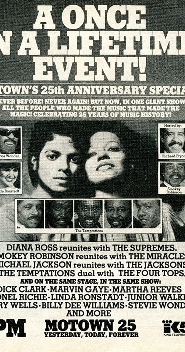 Motown 25: Yesterday, Today, Forever is a 1983 television special produced by Suzanne de Passe for Motown Records, The show was also co-written by de Passe along with Ruth Adkins Robinson who would go on to write shows with de Passe for the next 25 years, including the follow up label tributes—through “Motown 40,” Buz Kohan was the head writer of the threesome. The program was taped before a live studio audience at the Pasadena Civic Auditorium in Pasadena, California on March 25, 1983,[1] and broadcast on NBC on May 16. Among its highlights were Michael Jackson’s performance of “Billie Jean”, a Temptations/Four Tops “battle of the bands”, Marvin Gaye’s inspired speech about black music history and his memorable performance of “What’s Going On”, a Jackson 5 reunion.