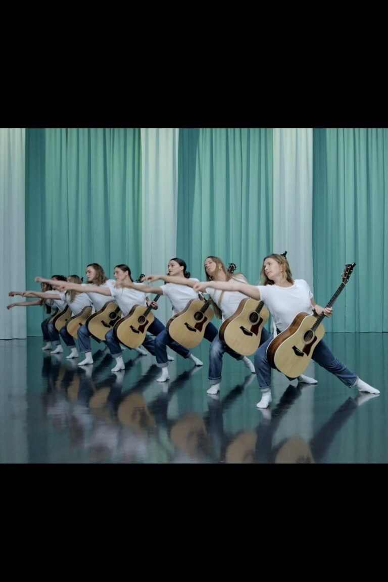 No Tomorrow is a new video installation by Kjartansson, choreographer Margrét Bjarnadóttir, and composer Bryce Dessner. Spanning six screens that encircle the room, the installation surrounds viewers with a performance of spatial music written for eight dancers with eight guitars. Recorded from the center of the performers’ space, the installation is kaleidoscopic, capturing the dancers as they weave within each screen and across the channels; their movements and melodies ranging from pastorale to rock and roll. Combining a variety of classic Western references – blue jeans and white t-shirts, the draped silk curtains of mid-20th century song and dance films, as well as lyrics drawn from the Archaic Greek poet Sappho and adventurer Vivant Denon, two sensualists millennia apart – the work spins notions of idealization and iconography.