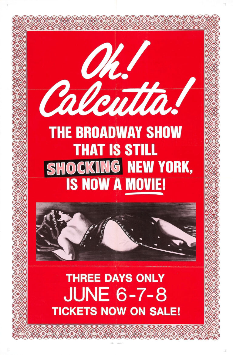 Based on the controversial off-Broadway musical comedy revue, “Oh! Calcutta!” is a series of musical numbers about sex and sexual mores. Most of the skits feature one or more performers in a state of undress, simulating sex, or both. The show sparked considerable controversy at the time because it featured extended scenes of total nudity, both male and female. The title is taken from a painting by Clovis Trouille, itself a pun on “O quel cul t’as!” French for “What an arse you have!”.
