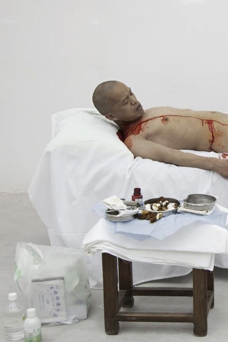 One Meter of Democracy (2010) challenged the endurance of viewers, as well as the courage of the artist. In a quasi-democratic process, He Yunchang invited approximately 20 friends to vote in a secret ballot on whether he should have a surgeon cut a one metre incision the length of his body, from collar bone to knee, without anaesthesia. The vote was carried by a narrow majority, with several abstaining. The performance was documented in video and photographs that reveal the emotional cost of witnessing this gruelling event. This work, sometimes also known as ‘Asking the Tiger for its Skin’ was also staged on a symbolic date: 10 October 2010 was the 99th anniversary of the Wuchang uprising and the Xinhai Revolution which led to the fall of the Qing Dynasty and the establishment of the Republic of China. The final image shows the group with sombre, shocked faces.