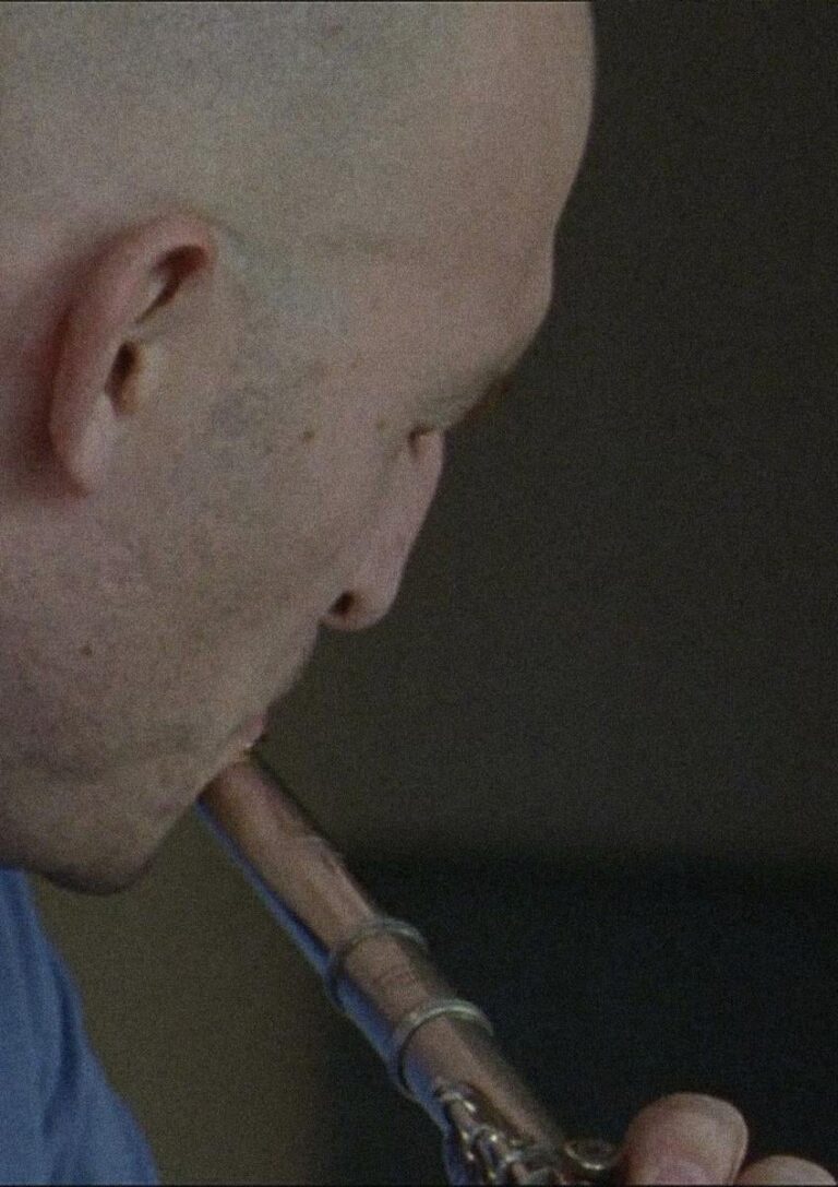 The film one, two, many consists of three performances: a flute piece with continuous breathing; a spoken monologue; and a song by four singers in front of an audience. Starting from different audio-visual perspectives, each section explores the existential space of the voice. Connecting the three performances are the central themes of the individual’s body, listening to the other, and finding the right distance for multiple voices in a social space.