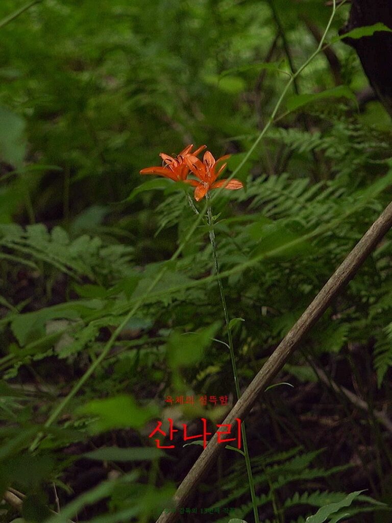 Deep in the mountains, a gold-rayed lily (Sannari) is in bloom in front of a dark cave. The red lily looks hideous in the middle of deep greens. It beckons to people to come over and see it so as to learn about peace. Sannari tells you to ‘look aside, not far from you,’ ‘look at the half of people who got sacrificed by anti-communist ideology,’ and says that ‘I am your wound,’ ‘How can you coexist with North Koreans, unless you accept even me.’ Peace begins with this enlightenment.