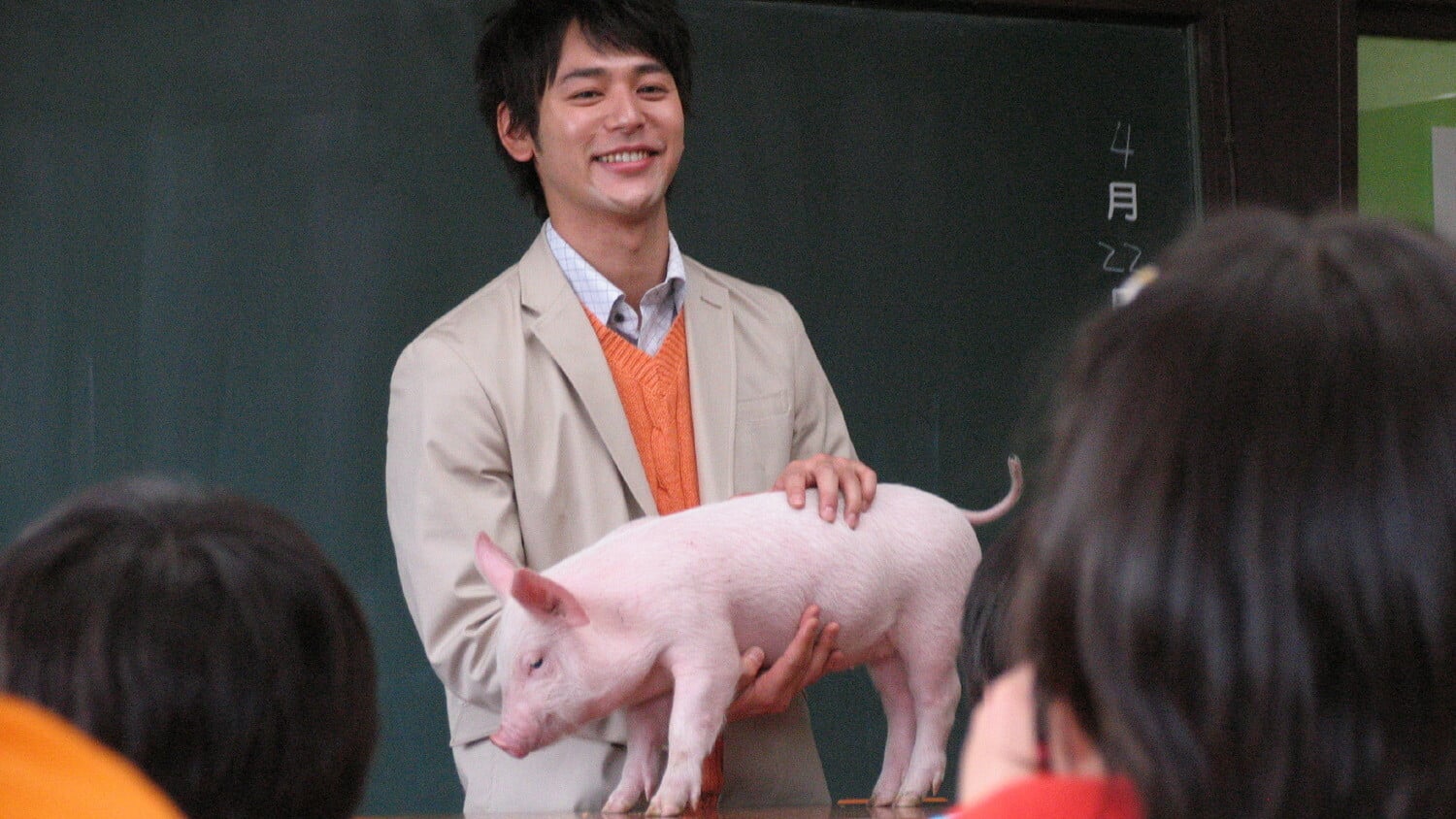 A sixth grade teacher raises a pig with his class.