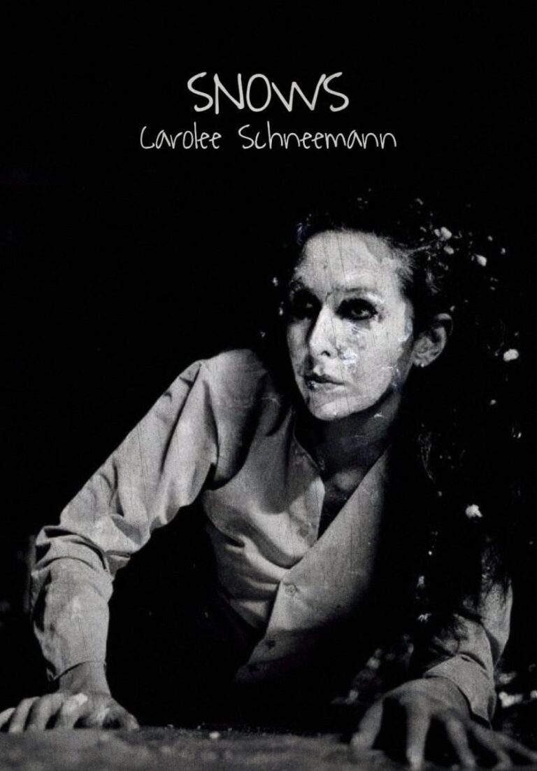 This is a newly restored version of documentation of the 1967 group performance Snows, which was built out of Schneemann’s outrage and sorrows over the atrocities of the Vietnam War. An ethereal stage environment combining colored light panels, film projection, torn collage, hanging sacks of colored water, “snow,” crusted branches, rope, foil and foam was the set and setting in which an audience-activated electronic switching system controlled elements of the performance/installation. Images from film, slide and live action propel silent, ghostly performers to become aggressor and victim, torturer and tortured, lover and beloved, as well as simply themselves in this breakthrough mixed-media film performance. (The film Viet-Flakes is a central element).