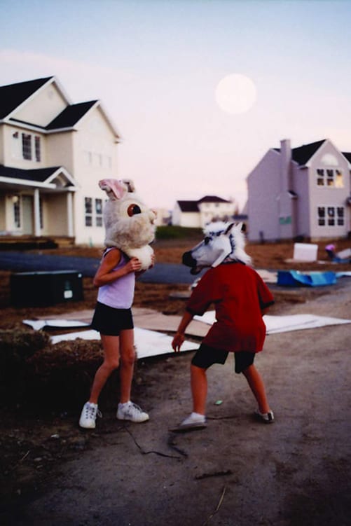 Streamside Day, explores the formative role of ideological and semiotic systems in establishing social rituals and traditions. Huyghe’s exhibition includes five murals, concealed behind five supplementary walls, which are revealed when the walls begin to slowly move through the gallery to configure a pavilion in which a short fiction film is projected. When the film ends, the walls retract to their original positions along the perimeter of the space, restoring the gallery to its pristine condition. After opening with scenes from an Edenic landscape, Huyghe’s film traces the formation of a burgeoning community hypothetically located in the Hudson Valley. The first of two sections limns a mythic kernel that is then instantiated in scenes from a typical inaugural celebration devised to forge communal identity.