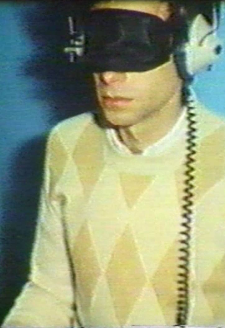 A group of people, blindfolded and fed distorted German dialogue through headphones, sit at a table and feel their way towards the food in the centre.
