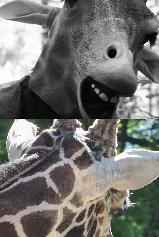 A giraffe and a zebra fight over an undefined baby creature in hopes of making it one of their own species.