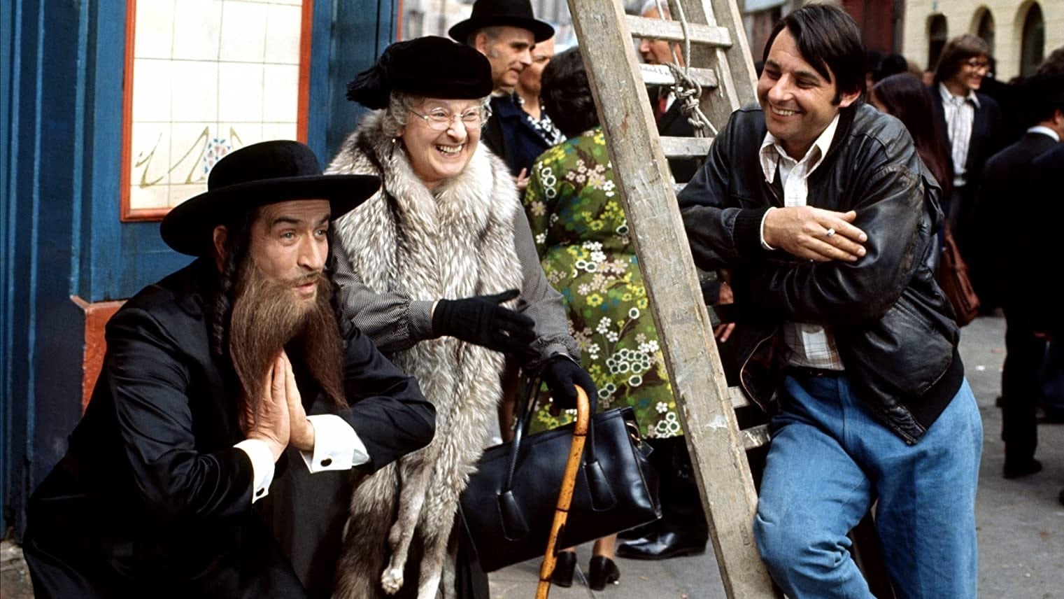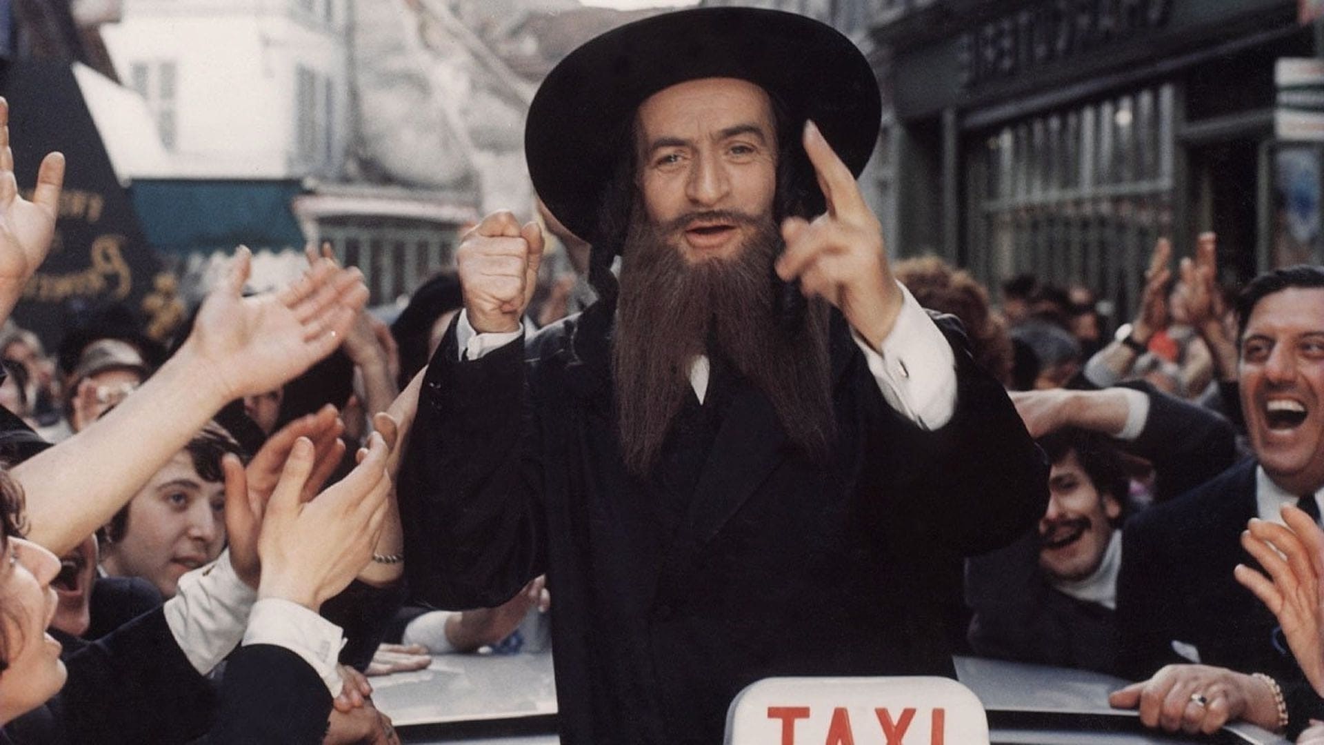 In this riot of frantic disguises and mistaken identities, Victor Pivert, a blustering, bigoted French factory owner, finds himself taken hostage by Slimane, an Arab rebel leader. The two dress up as rabbis as they try to elude not only assasins from Slimane’s country, but also the police, who think Pivert is a murderer. Pivert ends up posing as Rabbi Jacob, a beloved figure who’s returned to France for his first visit after 30 years in the United States. Adding to the confusion are Pivert’s dentist-wife, who thinks her husband is leaving her for another woman, their daughter, who’s about to get married, and a Parisian neighborhood filled with people eager to celebrate the return of Rabbi Jacob.