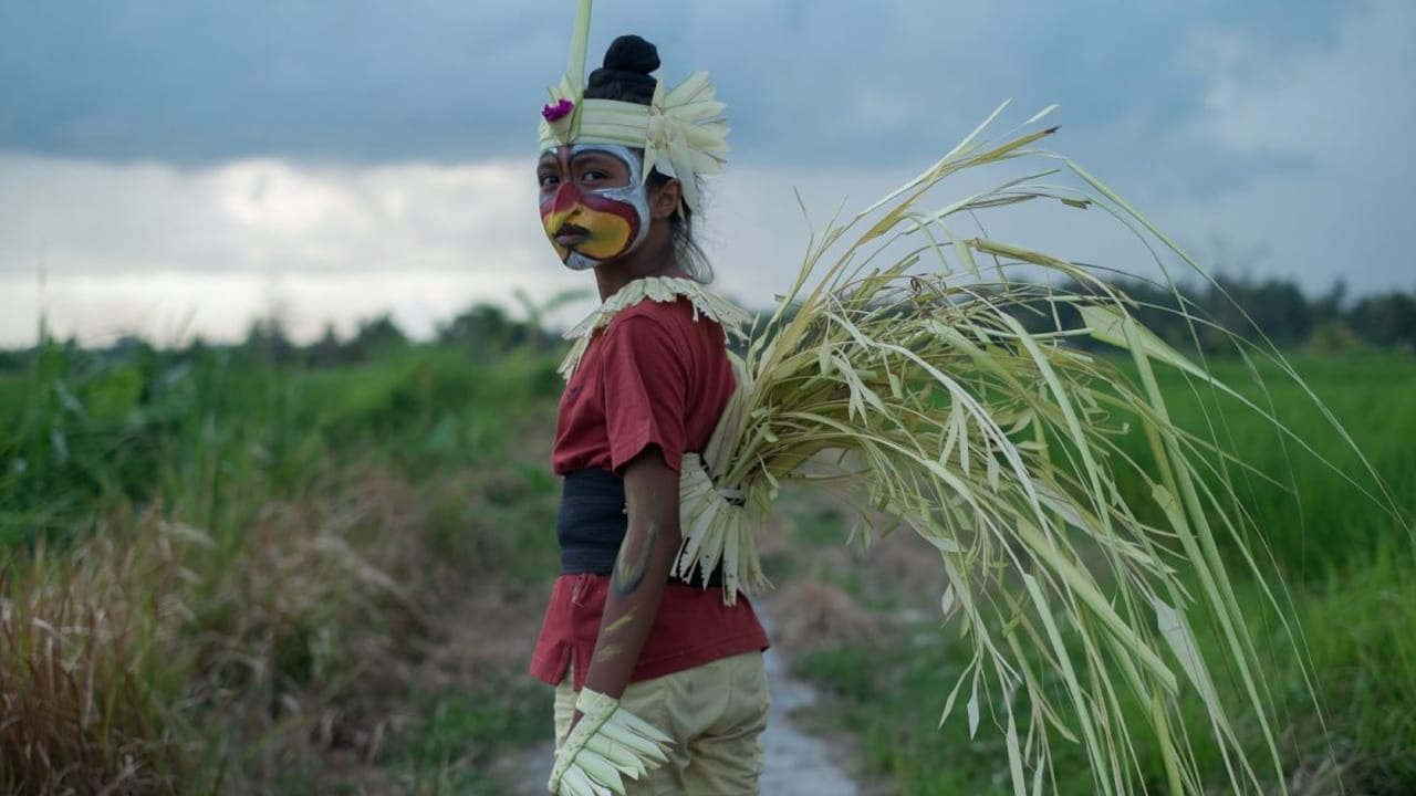 Tantra and Tantri are inseparable. When they secretly steal eggs from the family’s sacrificial offering, Tantri always gets the whites and Tantra the yolks. One day, however, the yolk is missing, as is Tantra. Her brother gravely ill and in hospital, Tantri starts slipping into magical parallel worlds, approaching the inevitable farewell through costumes, body paint and dance. When at one point Tantri’s mother washes the paint from her face, it is as if tenderly to expel the illusion that things can remain as they are. In long dream sequences and against the background of the Balinese philosophy of sekala – the seen – and niskala – the unseen – Andini relates how one ten-year-old girl deals with parting and grief.