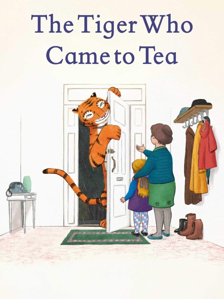 A young girl befriends a tiger and invites him over for tea.