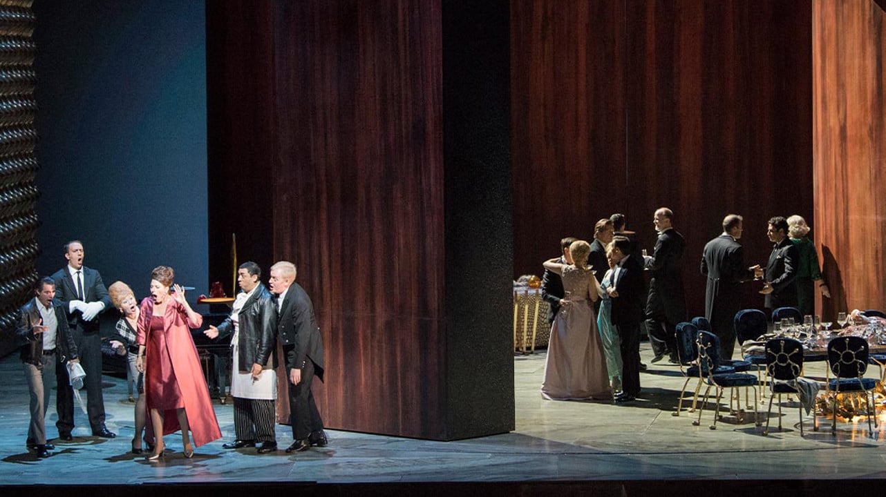 After the acclaimed Met premiere of Thomas Adès’s “The Tempest” in 2012, the composer returned with another masterpiece, this time inspired by filmmaker Luis Buñuel’s seminal surrealist classic “El Ángel Exterminador”, during the 2017–18 season. As the opera opens, a group of elegant socialites gather for a lavish dinner party, but when it is time to leave for the night, no one is able to escape. Soon, their behavior becomes increasingly erratic and savage. The large ensemble cast tackles both the vocal and dramatic demands of Adès’s opera with one riveting performance after another. Tom Cairns, who also penned the work’s libretto, directs an engrossing and inventive production, using a towering wooden archway to trap the characters onstage. And Adès himself takes the podium to conduct the frenzied score, which features a host of unconventional instruments, including the eerie electronic ondes Martenot.