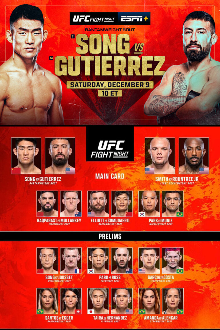 UFC Fight Night 233: Song vs. Gutiérrez was a mixed martial arts event produced by the Ultimate Fighting Championship that took place on December 9, 2023, at the UFC Apex facility in Enterprise, Nevada, part of the Las Vegas Metropolitan Area, United States. A bantamweight bout between Song Yadong and Chris Gutiérrez headlined the event. Preliminary card