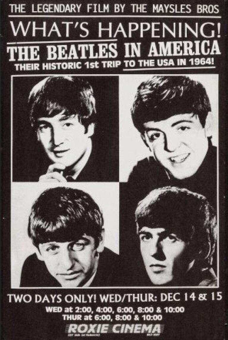 An account of John, Paul, George and Ringo’s first week in America. The Maysles follow the Fab Four for five days, from crazed airport reception to press conferences to backstage at the Ed Sullivan Show to hotel-room hanging out to their horrified encounter with the legendary deejay Murray the K to their equally frenzied homecoming.