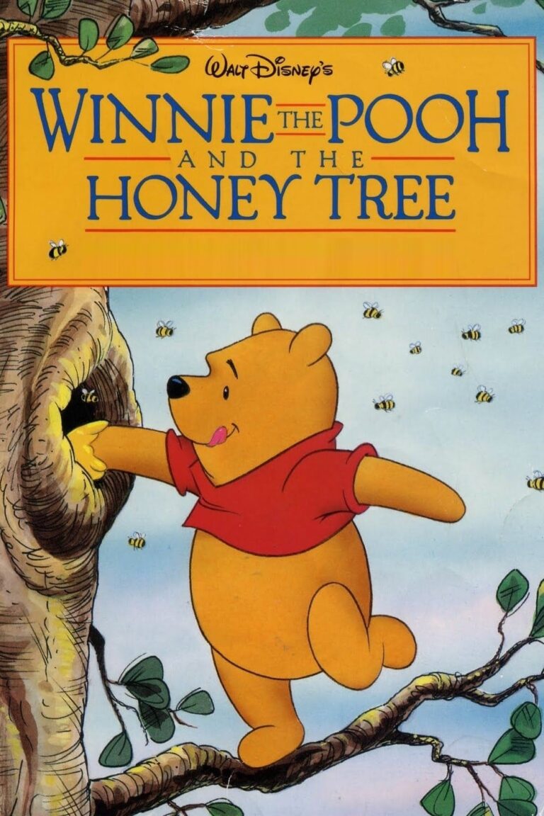 Christopher Robin’s bear attempts to raid a beehive in a tall tree.